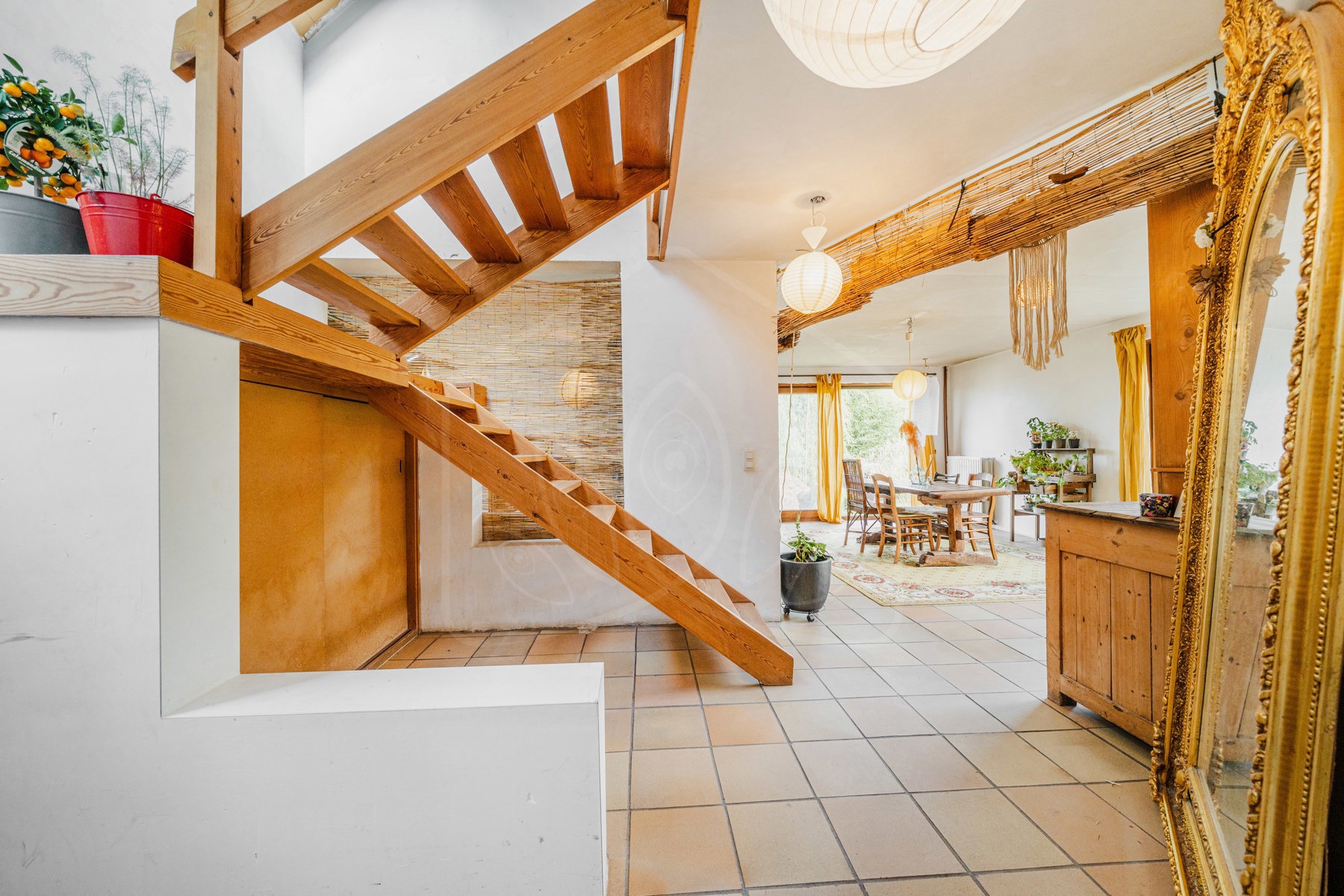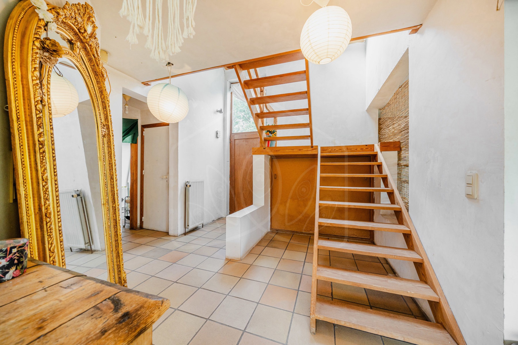 Vous accueille au rez : un chaleureux hall donnant accès au bureau et wc, idéal pour recevoir de la clientèle ou télétravailler en sérénité. La pièce de vie (+-44m²) offre un salon avec coin lecture et une salle à manger dotée de 2 accès sur l’extérieur. La cuisine, séparée par une verrière apporte charme, praticité et spacieux coin repas (à rénover mais fonctionnelle). Elle donne en outre sur l’entrée de la cave.